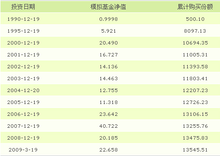 如果每个月可以省下500元钱进行投资,一年就省下6000元进行投资。假设从1990年12月开始做定期定额,到现在我们拥有多少?