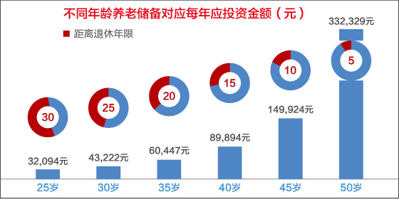 以准备180万元养老金为例,如果从25岁开始规划养老,每年需要32,094元,到了45岁每年则需要准备149,924元。